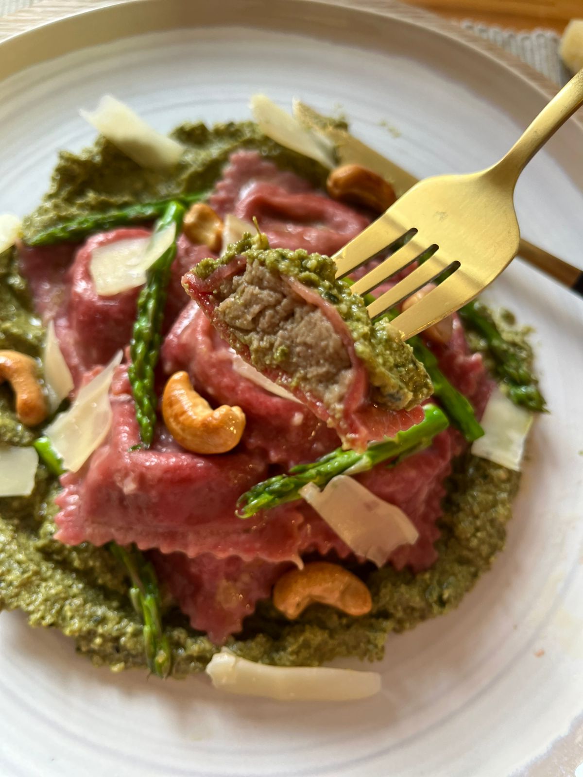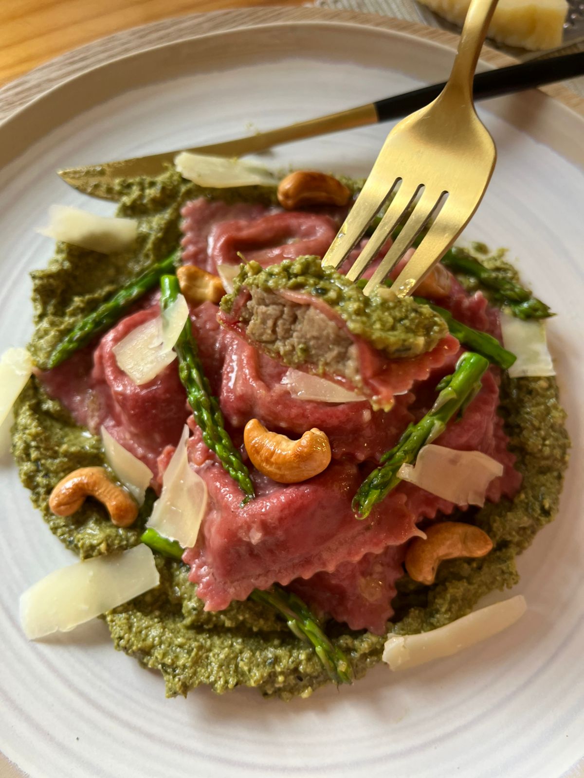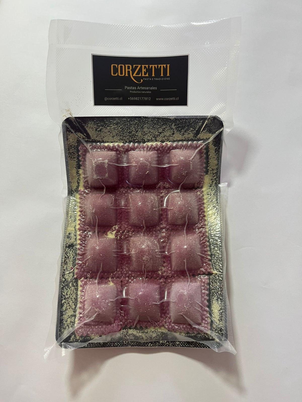 Su delicioso, suave y balanceado relleno de berenjenas con un toque de ajo chilote es uno de los preferidos de la familia. La coloración se logra con beterraga natural por lo cual se suaviza al cocinarlo. Es especial para mezclar con aceite de oliva o pesto.